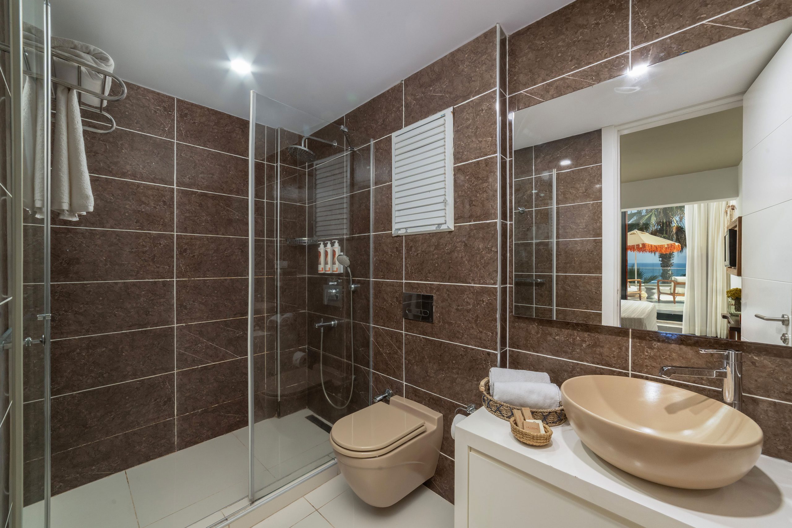 25 metrekarelik bu ferah odada, denizin sesiyle uyanır, güne özel balkonunda başlarsın. Manzara sessizce eşlik eder; bazen bir kahvaltıya, bazen de tek başına geçirdiğin bir akşama…